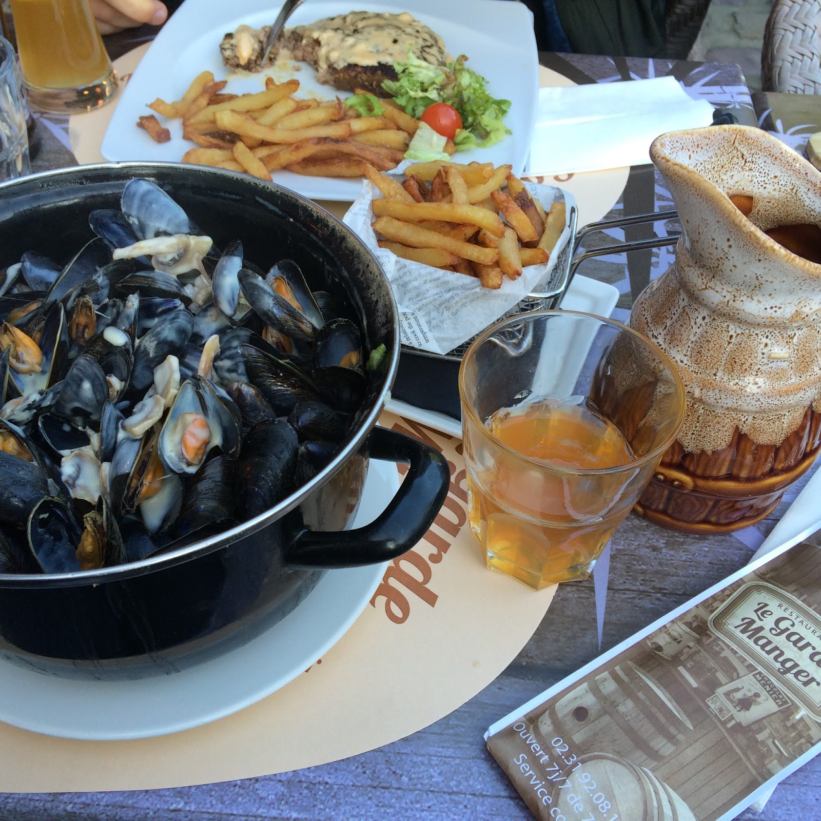 After finishing up our day of touring in Normandy, we want back to Bayeux for dinner. We walked around a little bit trying to figure out our options. We ended up eating at LaGarde Manger, which had really nice outside seating. The local food in Normandy is amazing and that also extended to their local drink of choice, cider. We started dinner with a local cheese (Camembert) and local cured meat (like mix between salami and ham). Jer had a steak and frites and I had mussels in Normandy sauce (cheese and mushrooms) with frites. I love that everything comes with frites. The presentation between the cider and mussels just made it picture worthy.