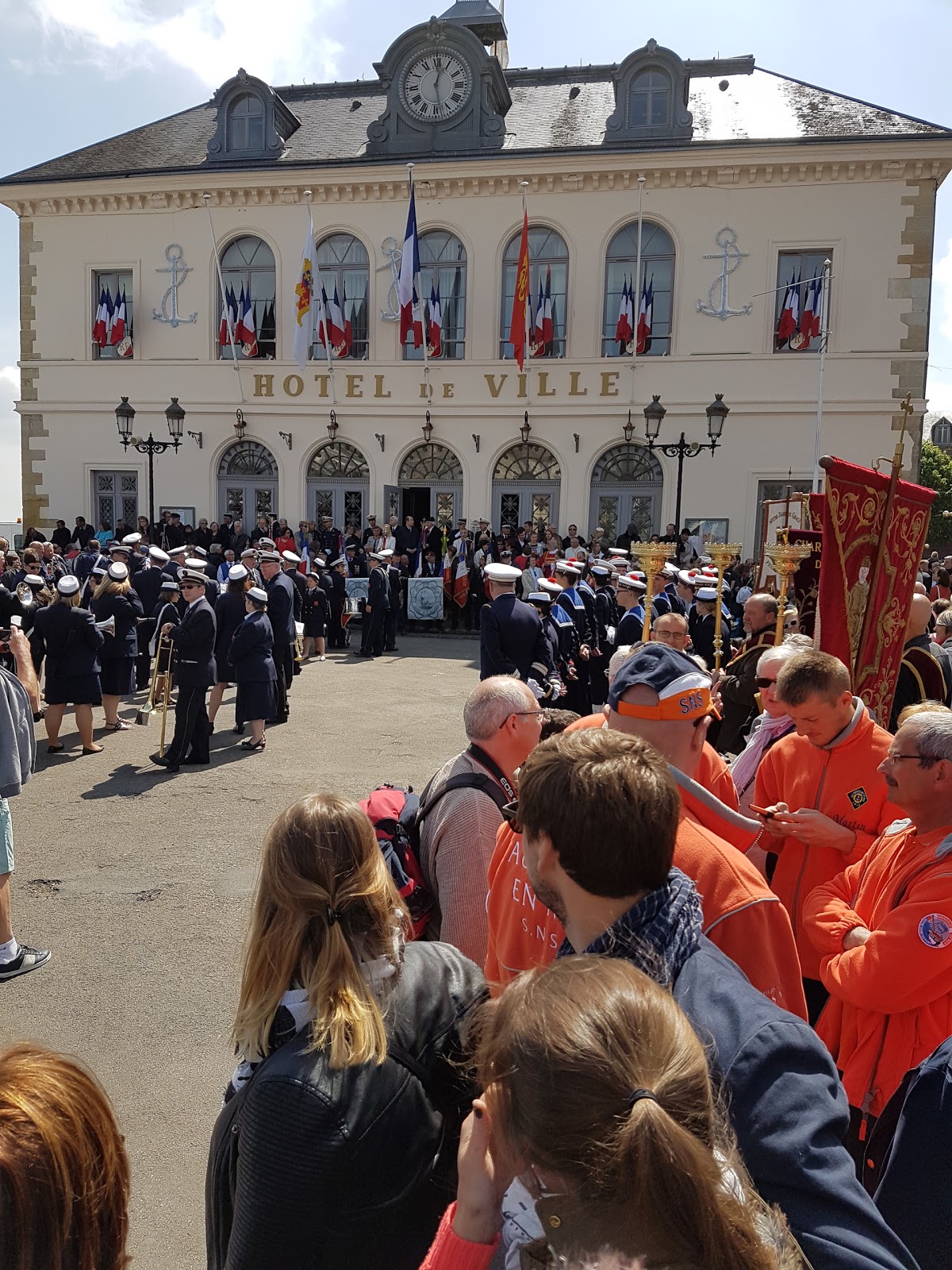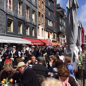 We ended up having perfect seats for the La Fete des Marins – Sailors Festival. This is held each Whit Monday and has been going on since 1861. The festival is a gathering of all those linked to the sea. We witnessed the parade from the Notre Dame church to the town center. The parade consisted of small bands (some no more than 10 people), people dressed up in stripped shirts, the local navy unit, and locals with kids carrying large model ships (need 2-4 kids to carry it on a platform) as well as babies in the model ships. Yes there were babies (I’m assuming less than 1 year old) in the model ships that were carried by 4 guys (again on a platform). Some of the babies got into it, waving to the crowd and you could hear to oos and ahhs. Overall, we were in the right place at the right time. (This also explains why there were so many people in town).