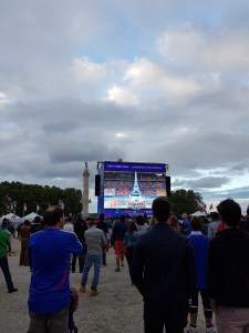We then headed for the Fan Zone, which was at the Place de Quincones. I’m sorry to say, but it put the Fan Zones at the Final Four to shame. Security was super tight. The list of banned items ran as long as could be. It included a note that no alcoholic beverages were allowed in and if caught you could be put in jail for 1 year and fined 7,500 Euros. That’s one heck of a deterrent. There was a place to check bags, bikes and skateboards. Bags smaller than 25cm x 25cm x 25cm are allowed in, so basically small women’s hand bags. And the security pat down, well let’s just say, I if I had a penny in my pocket, they would have found it.