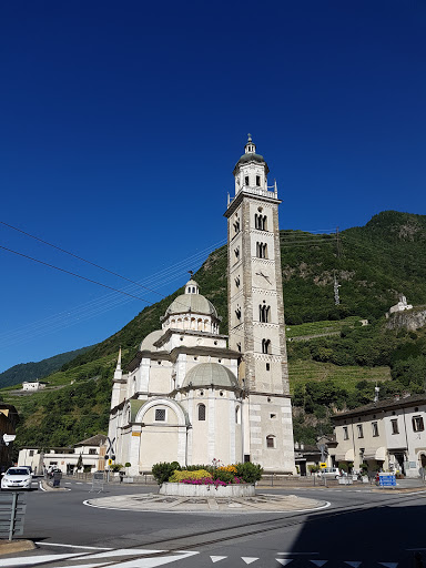 Upon arriving in Tirano we had just over an hour before our special train, the Bernina Express, left to head up into the mountains. As usually with us we said why not go exploring. We found a cafe just outside of the train station that was open and had an Italian espresso and an excellent fresh croissant. After that we just started walking around the city. In the distance we could see a church steeple so we decided why not walk down and see. Of course the setting for this church at the base of the mountains turned in some beautiful views and we could tell we were in for the start of a beautiful day. Once we looked around the church for a while we decided it was time to head back and start getting ready to get on the train.