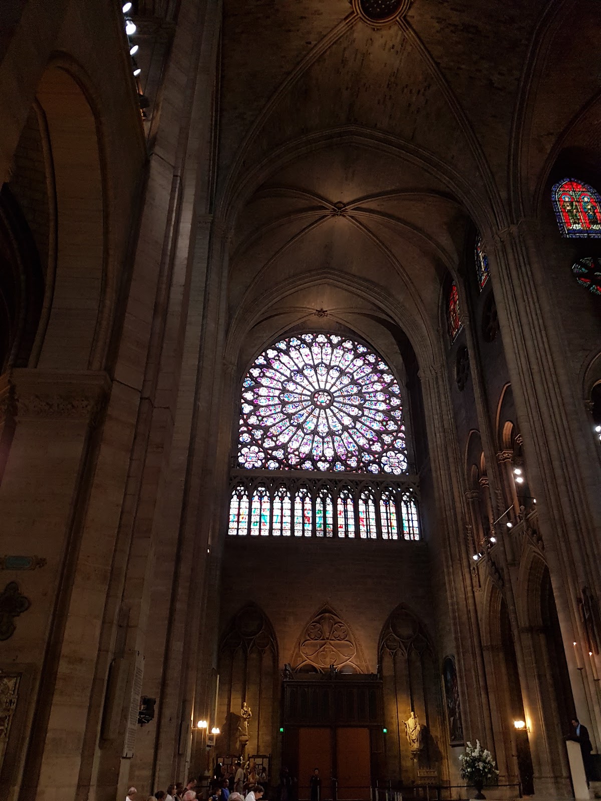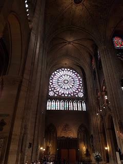 After our normal morning cafe and pastries, we headed to Notre Dame. It is free to get into Notre Dame and most of the time the line looks intimidating but it is just a security check and it moves rather quickly. Fun facts about Notre Dame, it is built on an island in the middle of the Seine and it was built by the people of Paris who would lug the huge rocks from nearby quarries without any help from machinery creating the actual hunchbacks of Notre Dame. When we were inside they were actually starting a service, in French. It was awe inspiring to see mass while in such a historic and religiously significant building. One of my favorite pieces of architecture in the church is the original rose window. Take a look for yourself.