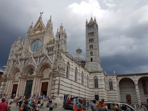 Today we drove 2 hours South to Sienna then onto Volterra. The plan was to get to Sienna to enjoy the Wednesday morning market. I think that was everyone’s thought is all of Tuscany. Finding parking was a nightmare. But eventually, we found a parking garage with a few spaces left. We then headed to the market which we got caught in an apocalyptic down pour. OK I may be being a little dramatic, but it was miserable.